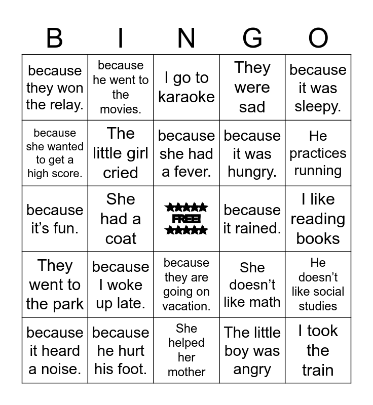 This bingo card has a free space and 24 words: because I woke up late., because he hurt his foot., because she had a fever., because it heard a noise., because it was sleepy., because they won the relay., because she wanted to get a high score., because he went to the movies., because it rained., because they are going on vacation., because it was hungry., because it’s fun., She doesn’t like math, He doesn’t like social studies, The little girl cried, The little boy was angry, I like reading books, I go to karaoke, He practices running, She had a coat, I took the train, They went to the park, They were sad and She helped her mother.