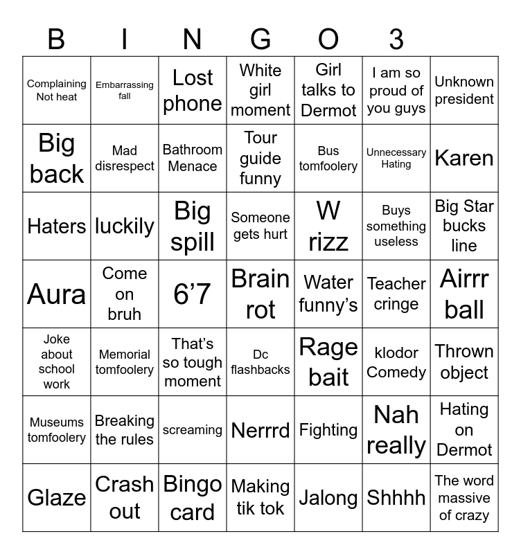 This bingo card has a free space and 48 words: Fighting, Unnecessary Hating, Making tik tok, Come on bruh, Big spill, Airrr ball, Embarrassing fall, Crash out, I am so proud of you guys, Dc flashbacks, Unknown president, White girl moment, Buys something useless, W rizz, Museums tomfoolery, Teacher cringe, Big back, Karen, Nah really, Girl talks to Dermot, Bus tomfoolery, 6’7, Complaining Not heat, Mad disrespect, Hating on Dermot, Bathroom Menace, Big Star bucks line, Glaze, Someone gets hurt, luckily, Shhhh, Water funny’s, Thrown object, Breaking the rules, Aura, Rage bait, klodor Comedy, Haters, That’s so tough moment, screaming, Joke about school work, The word massive of crazy, Lost phone, Bingo card, Tour guide funny, Nerrrd, Memorial tomfoolery and Jalong.