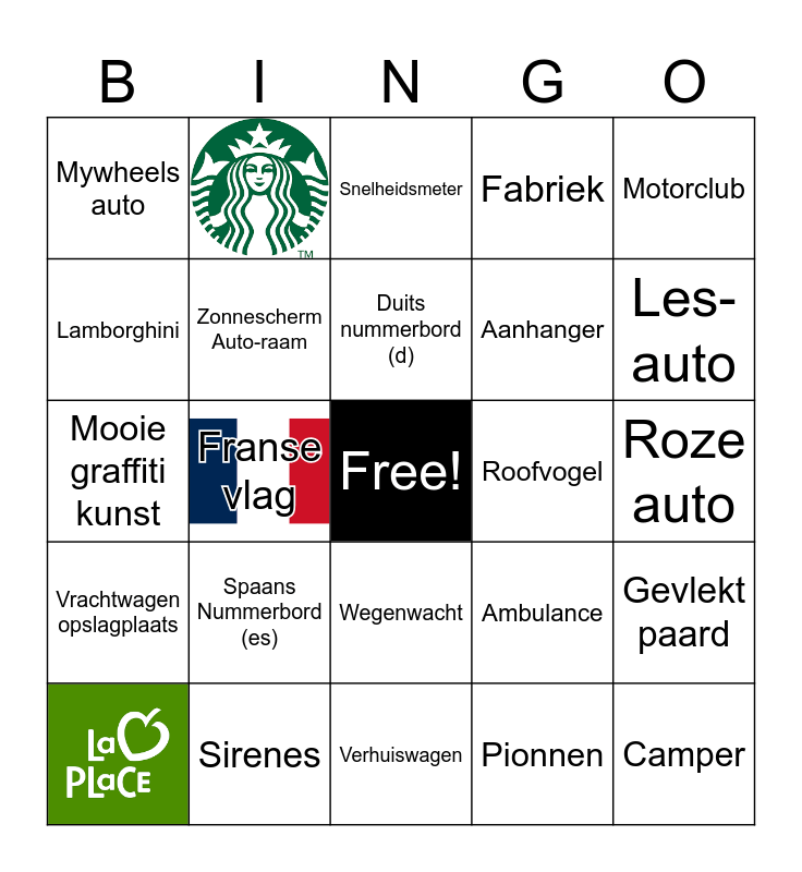 This bingo card has 3 images, a free space and 22 words: Spaans Nummerbord (es), Sirenes, Duits nummerbord (d), Motorclub, Mywheels auto, Lamborghini, Roofvogel, Wegenwacht, Aanhanger, Mooie graffiti kunst, Ambulance, Gevlekt paard, Zonnescherm Auto-raam, Pionnen, Roze auto, Snelheidsmeter, Les-auto, Franse vlag, Camper, Vrachtwagen opslagplaats, Fabriek and Verhuiswagen.