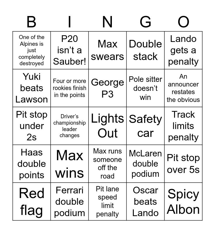 This bingo card has a free space and 24 words: Max wins, Ferrari double podium, George P3, Red flag, Lando gets a penalty, One of the Alpines is just completely destroyed, Yuki beats Lawson, P20 isn’t a Sauber!, Safety car, Max runs someone off the road, Pole sitter doesn’t win, Pit stop under 2s, McLaren double podium, Pit stop over 5s, Four or more rookies finish in the points, Oscar beats Lando, Track limits penalty, Max swears, An announcer restates the obvious, Driver’s championship leader changes, Spicy Albon, Haas double points, Double stack and Pit lane speed limit penalty.