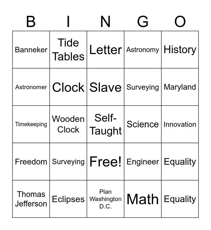 This bingo card has 26 words: Free!, Math, Slave, Eclipses, History, Banneker, Astronomer, Tide Tables, Innovation, Engineer, Surveying, Timekeeping, Equality, Thomas Jefferson, Wooden Clock, Calendar, Astronomy, Freedom, Letter, Self-Taught, Maryland, Plan Washington D.C., Science, Surveying, Clock and Equality.