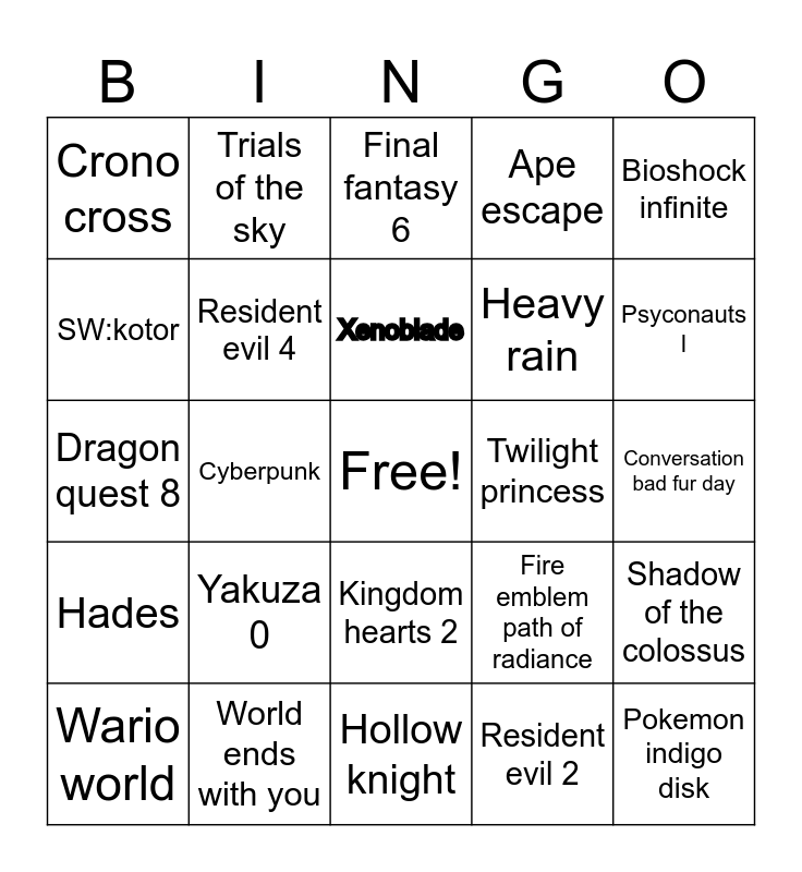 This bingo card has a free space and 24 words: Yakuza 0, World ends with you, Xenoblade, Wario world, Bioshock infinite, Crono cross, SW:kotor, Trials of the sky, Twilight princess, Kingdom hearts 2, Heavy rain, Dragon quest 8, Fire emblem path of radiance, Shadow of the colossus, Resident evil 4, Resident evil 2, Conversation bad fur day, Final fantasy 6, Psyconauts l, Cyberpunk, Pokemon indigo disk, Hades, Ape escape and Hollow knight.