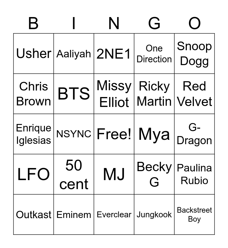 This bingo card has a free space and 24 words: 50 cent, Eminem, Missy Elliot, Outkast, Snoop Dogg, Usher, Chris Brown, Aaliyah, Mya, MJ, Ricky Martin, Enrique Iglesias, Becky G, Paulina Rubio, BTS, Jungkook, G-Dragon, 2NE1, Red Velvet, NSYNC, Backstreet Boy, LFO, One Direction and Everclear.