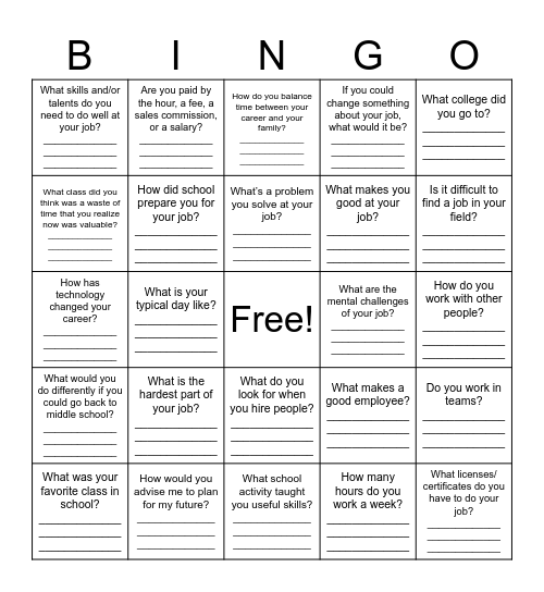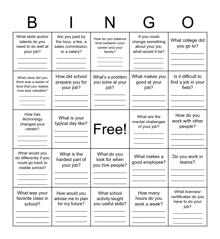 This bingo card has a free space and 39 words: What is the best part of your job? _____________ _____________ _____________, Did you know you were going to do this job when you were our age? _____________ _____________ _____________, What benefits/ perks do you get with your job? _____________ _____________ _____________, How did school prepare you for your job? _____________ _____________ _____________, What was your favorite class in school? _____________ _____________ _____________, What do you look for when you hire people? _____________ _____________ _____________, What’s a problem you solve at your job? _____________ _____________ _____________, What was the most helpful lesson you learned at school? _____________ _____________ _____________, What college did you go to? _____________ _____________ _____________, What would you do differently if you could go back to middle school? _____________ _____________ _____________, What is your typical day like? _____________ _____________ _____________, If you could change something about your job, what would it be?_____________ _____________ _____________, What licenses/ certificates do you have to do your job?_____________ _____________ _____________, How do you work with other people?_____________ _____________ _____________, What are the mental challenges of your job?_____________ _____________ _____________, What is the hardest part of your job?_____________ _____________ _____________, How many years have you been in this job?_____________ _____________ _____________, What skills and/or talents do you need to do well at your job?_____________ _____________ _____________, Why did you choose this job?_____________ _____________ _____________, What makes a good employee?_____________ _____________ _____________, What class did you think was a waste of time that you realize now was valuable?_____________ _____________ _____________, What school activity taught you useful skills?_____________ _____________ _____________, What makes you good at your job?_____________ _____________ _____________, Is it difficult to find a job in your field?_____________ _____________ _____________, Do you get vacation time or personal days? _____________ _____________ _____________, What do you know now that you wish you knew during your time at school?_____________ _____________ _____________, Do you feel like you’re paid fairly for the amount of work you do?_____________ _____________ _____________, How would you recommend I learn more about this line of work?_____________ _____________ _____________, Does your work limit your personal life?_____________ _____________ _____________, Are you paid by the hour, a fee, a sales commission, or a salary?_____________ _____________ _____________, What is the average entry-level salary for your job and how does it change over time?_____________ _____________ _____________, If I decided to pursue this career path, what advice would you give me?_____________ _____________ _____________, How do you balance time between your career and your family?_____________ _____________ _____________, How would you advise me to plan for my future?_____________ _____________ _____________, How many hours do you work a week?_____________ _____________ _____________, What makes a good boss?_____________ _____________ _____________, Do you work in teams?_____________ _____________ _____________, How has technology changed your career?_____________ _____________ _____________ and What changes do you see to your job in the future?_____________ _____________ _____________.