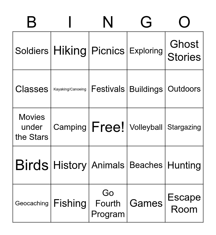 This bingo card has a free space and 24 words: History, Fishing, Festivals, Geocaching, Ghost Stories, Soldiers, Classes, Hiking, Volleyball, Animals, Buildings, Movies under the Stars, Beaches, Hunting, Kayaking/Canoeing, Games, Stargazing, Picnics, Outdoors, Camping, Escape Room, Birds, Exploring and Go Fourth Program.