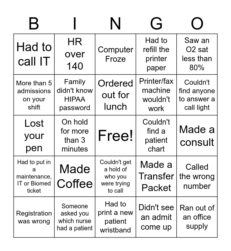 This bingo card has a free space and 24 words: Registration was wrong, Made Coffee, Ordered out for lunch, Didn't see an admit come up, Saw an O2 sat less than 80%, Had to call IT, HR over 140, Computer Froze, Couldn't find a patient chart, Made a consult, Lost your pen, Family didn't know HIPAA password, Made a Transfer Packet, Called the wrong number, More than 5 admissions on your shift, Someone asked you which nurse had a patient, Had to print a new patient wristband, Had to refill the printer paper, Couldn't find anyone to answer a call light, Had to put in a maintenance, IT or Biomed ticket, On hold for more than 3 minutes, Couldn't get a hold of who you were trying to call, Printer/fax machine wouldn't work and Ran out of an office supply.