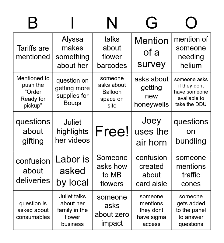 This bingo card has a free space and 24 words: Labor is asked by local, Juliet talks about her family in the flower business, someone asks about Balloon space on site, question is asked about consumables, mention of someone needing helium, Tariffs are mentioned, Mentioned to push the "Order Ready for pickup", Alyssa makes something about her, Joey uses the air horn, Someone asks how to MB flowers, asks about getting new honeywells, questions about gifting, confusion created about card aisle, someone mentions traffic cones, question on getting more supplies for Bouqs, someone mentions they dont have sigma access, questions on bundling, talks about flower barcodes, someone asks if they dont have someone available to take the DDU, Juliet highlights her videos, someone gets added to the panel to answer questions, confusion about deliveries, Mention of a survey and someone asks about zero impact.