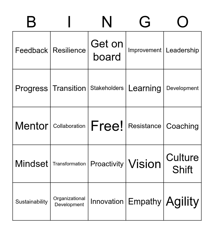 This bingo card has a free space and 48 words: Adaptation, Agility, Change Management, Innovation, Transformation, Readiness, Resilience, Flexibility, Progress, Evolution, Transition, Improvement, Culture Shift, Vision, Strategy, Communication, Stakeholders, Resistance, Sponsorship, Leadership, Collaboration, Empathy, Feedback, Learning, Growth, Development, Sustainability, Adaptability, Proactivity, Mindset, Change Curve, Initiative, Change Network, Continuous Improvement, Organizational Development, Super Hero, Change Request, Coaching, Customer Focus, Culture Change, Barriers to Change, Change Leadership, Get on board, Champion, Mentor, Positivity, New and Training.