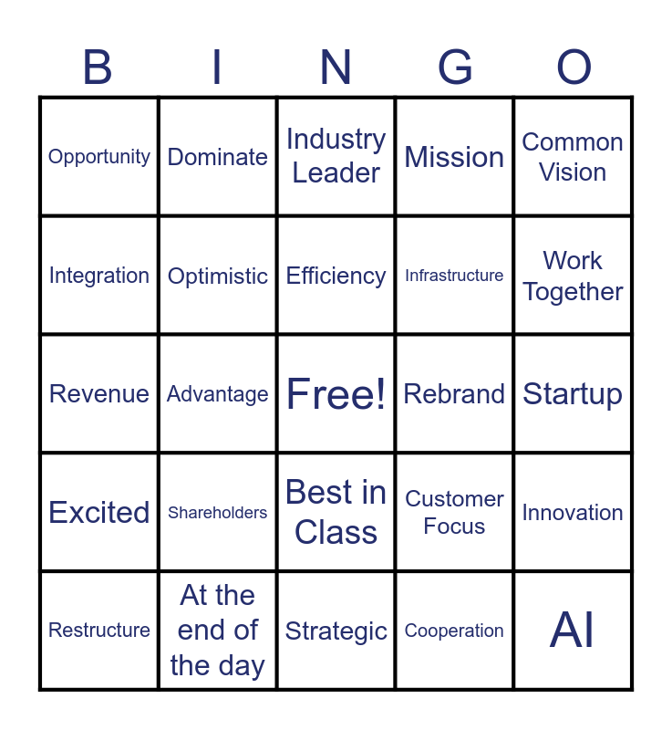 This bingo card has a free space and 34 words: Synergy, Cooperation, Gameplan, Brilliant, Excited, Optimistic, Common Vision, Restructure, Dominate, Culture, Efficiency, Industry Leader, New Markets, Common Technology, Rebrand, Work Together, At the end of the day, Revenue, Shareholders, Customer Focus, Best in Class, Capitalize, Opportunity, Startup, Strategic, AI, Mission, Operational excellence, Infrastructure, Integration, Frictionless, Advantage, Innovation and Next-generation.