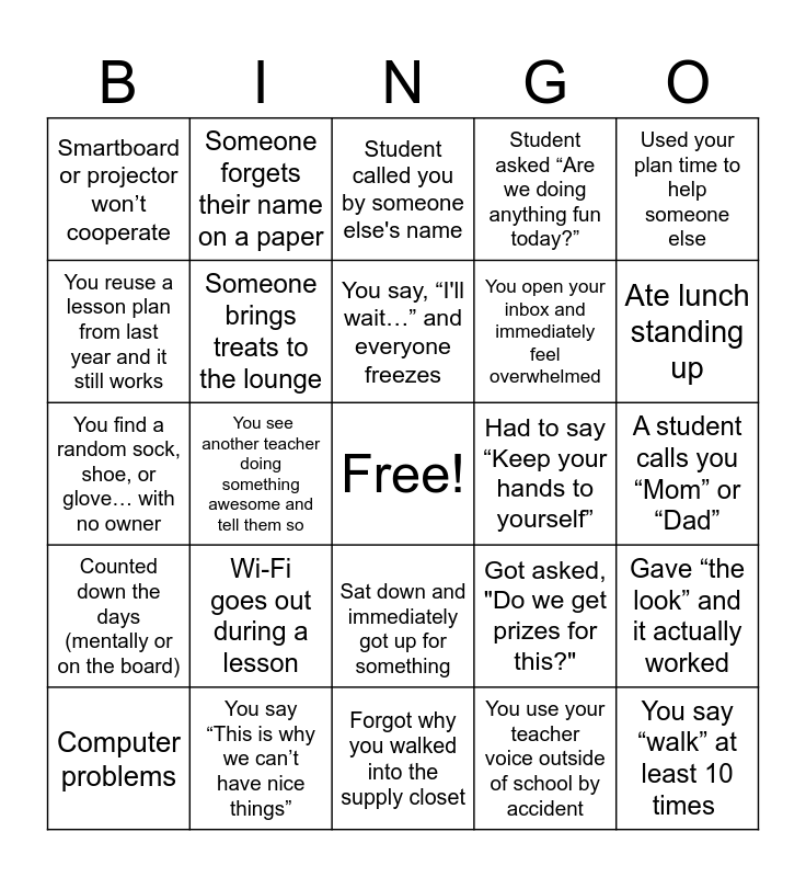 This bingo card has a free space and 24 words: Wi-Fi goes out during a lesson, You say “This is why we can’t have nice things”, You say, “I'll wait…” and everyone freezes, Computer problems, Used your plan time to help someone else, Smartboard or projector won’t cooperate, You reuse a lesson plan from last year and it still works, Someone forgets their name on a paper, Had to say “Keep your hands to yourself”, Sat down and immediately got up for something, You open your inbox and immediately feel overwhelmed, You find a random sock, shoe, or glove… with no owner, Got asked, "Do we get prizes for this?", Gave “the look” and it actually worked, Someone brings treats to the lounge, You use your teacher voice outside of school by accident, A student calls you “Mom” or “Dad”, Student called you by someone else's name, Ate lunch standing up, You see another teacher doing something awesome and tell them so, You say “walk” at least 10 times, Counted down the days (mentally or on the board), Student asked “Are we doing anything fun today?” and Forgot why you walked into the supply closet.