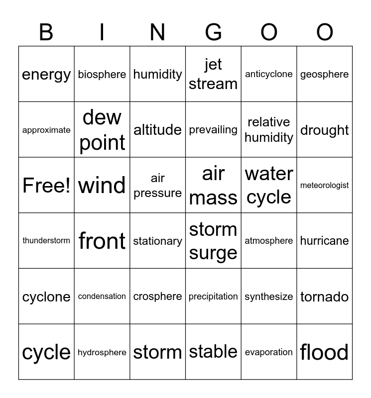 This bingo card has 36 words: precipitation, crosphere, stable, approximate, thunderstorm, air mass, dew point, storm, anticyclone, synthesize, drought, jet stream, tornado, wind, prevailing, energy, cyclone, water cycle, Free!, humidity, air pressure, front, storm surge, stationary, atmosphere, biosphere, relative humidity, hydrosphere, altitude, geosphere, flood, cycle, hurricane, meteorologist, condensation and evaporation.