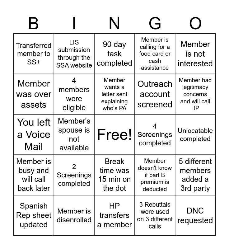 This bingo card has a free space and 24 words: Spanish Rep sheet updated, 2 Screenings completed, Member wants a letter sent explaining who's PA, 3 Rebuttals were used on 3 different calls, Member is not interested, Transferred member to SS+, LIS submission through the SSA website, 90 day task completed, 4 Screenings completed, Unlocatable completed, You left a Voice Mail, 4 members were eligible, Member doesn't know if part B premium is deducted, 5 different members added a 3rd party, Member was over assets, Member is disenrolled, HP transfers a member, Member is calling for a food card or cash assistance, Member had legitimacy concerns and will call HP, Member is busy and will call back later, Member's spouse is not available, Break time was 15 min on the dot, Outreach account screened and DNC requested.