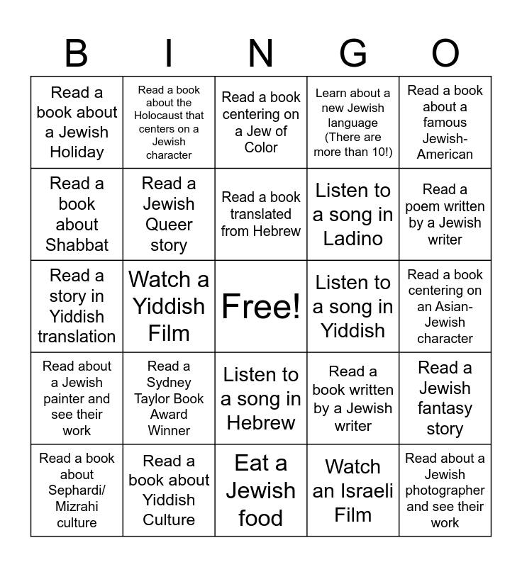 This bingo card has a free space and 24 words: Read a Sydney Taylor Book Award Winner, Read a book about Yiddish Culture, Read a book translated from Hebrew, Read a book about Sephardi/ Mizrahi culture, Read a book about a famous Jewish-American, Read a book about a Jewish Holiday, Read a book about Shabbat, Read a book about the Holocaust that centers on a Jewish character, Listen to a song in Yiddish, Listen to a song in Hebrew, Listen to a song in Ladino, Read a story in Yiddish translation, Read a book written by a Jewish writer, Read a Jewish fantasy story, Read a Jewish Queer story, Watch an Israeli Film, Read a book centering on an Asian-Jewish character, Read a book centering on a Jew of Color, Read a poem written by a Jewish writer, Watch a Yiddish Film, Read about a Jewish photographer and see their work, Read about a Jewish painter and see their work, Learn about a new Jewish language (There are more than 10!) and Eat a Jewish food.