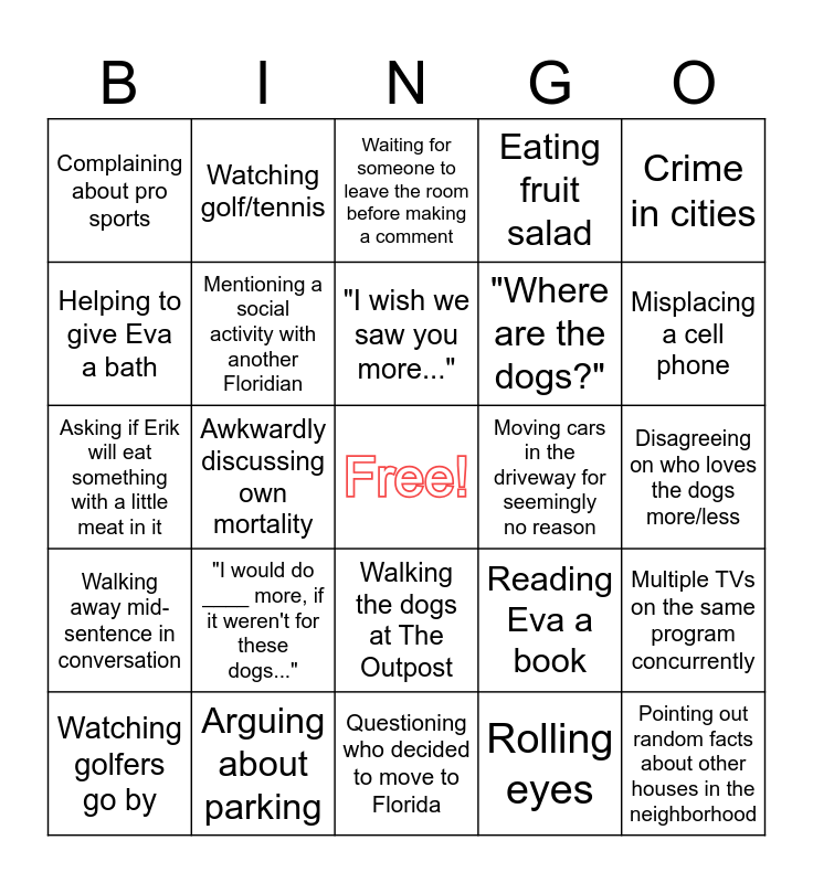 This bingo card has a free space and 24 words: "I would do ____ more, if it weren't for these dogs...", Arguing about parking, "I wish we saw you more...", Watching golfers go by, Crime in cities, Complaining about pro sports, Helping to give Eva a bath, Watching golf/tennis, Moving cars in the driveway for seemingly no reason, Walking the dogs at The Outpost, "Where are the dogs?", Asking if Erik will eat something with a little meat in it, Reading Eva a book, Multiple TVs on the same program concurrently, Mentioning a social activity with another Floridian, Rolling eyes, Disagreeing on who loves the dogs more/less, Waiting for someone to leave the room before making a comment, Misplacing a cell phone, Awkwardly discussing own mortality, Pointing out random facts about other houses in the neighborhood, Walking away mid-sentence in conversation, Eating fruit salad and Questioning who decided to move to Florida.