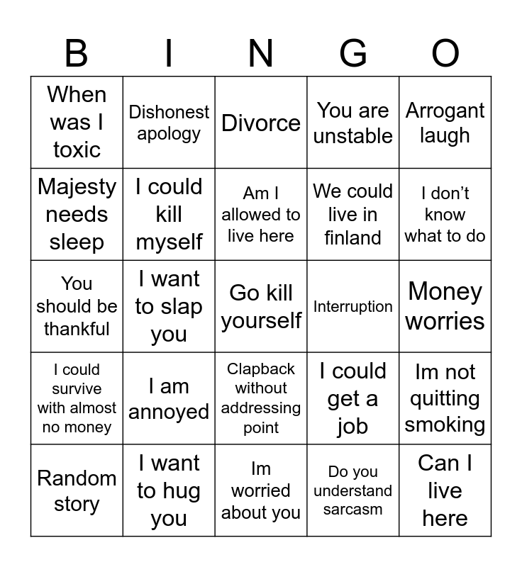 This bingo card has a free space and 24 words: I am annoyed, I want to hug you, Am I allowed to live here, Random story, Arrogant laugh, When was I toxic, Majesty needs sleep, Dishonest apology, Interruption, Clapback without addressing point, We could live in finland, You should be thankful, I could get a job, Im not quitting smoking, I could kill myself, Do you understand sarcasm, Money worries, Divorce, I don’t know what to do, I want to slap you, Can I live here, I could survive with almost no money, You are unstable and Im worried about you.