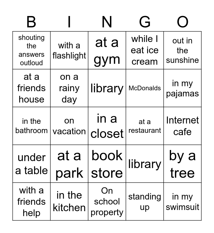 This bingo card has 25 words: at a park, On school property, library, with a friends help, out in the sunshine, shouting the answers outloud, at a friends house, with a flashlight, at a restaurant, book store, McDonalds, in the bathroom, library, by a tree, on a rainy day, in my swimsuit, Internet cafe, at a gym, in my pajamas, on vacation, in a closet, in the kitchen, under a table, while I eat ice cream and standing up.