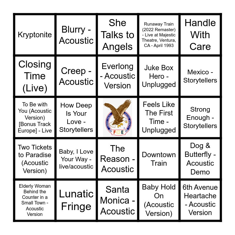 This bingo card has a free space and 53 words: 10 3am (acoustic) (3:45), 6th Avenue Heartache - Acoustic Version, A World Without Heroes - Live, Baby Hold On (Acoustic Version), Baby, I Love Your Way - live/acoustic, Back On The Chain Gang - Storytellers, Blurry - Acoustic, China Girl - Storytellers, Closing Time (Live), Comedown - Acoustic Version / Live From 107.7 The End, Seattle/1995, Creep - Acoustic, Cumbersome - Acoustic, Dog & Butterfly - Acoustic Demo, Downtown Train, Edge of Seventeen - Storytellers, Elderly Woman Behind the Counter in a Small Town - Acoustic Version, Everlong - Acoustic Version, Feels Like The First Time - Unplugged, Hand In My Pocket - Live, Handle With Care, How Deep Is Your Love - Storytellers, Iris - Acoustic, Juke Box Hero - Unplugged, Kryptonite, Layla - Acoustic Live, Lunatic Fringe, Man On The Moon, Margaritaville, Meet Virginia - Acoustic Version, Mexico - Storytellers, Never Tear Us Apart - Live, Pink Houses - Bonus Track, Plush - Acoustic, Rain King - Live At Chelsea Studios, New York/1997, Rain King - Live At Chelsea Studios, New York/1997, Rooster - Live at the Majestic Theatre, Brooklyn, NY - April 1996, Runaway Train (2022 Remaster) - Live at Majestic Theatre, Ventura, CA - April 1993, Santa Monica - Acoustic, She Talks to Angels, Signs - Live At The Trocadero / 1990, Simple Man - Acoustic, Stay (I Missed You) - Storytellers, Strong Enough - Storytellers, Talk Dirty To Me - Live On MTV Unplugged, Thank U - Live, The Reason - Acoustic, The Sound of Silence - Acoustic Version, These Are Days - Live Unplugged, To Be with You (Acoustic Version) [Bonus Track Europe] - Live, Two Tickets to Paradise (Acoustic Version), Ventura Highway - Live at XM Performance Theater, Washington D.C - October 2005, Who Will Save Your Soul - Storytellers and Zombie - Acoustic Version.