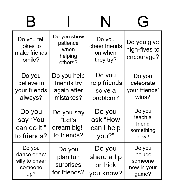 This bingo card has 16 words: Do you plan fun surprises for friends?, Do you teach a friend something new?, Do you cheer friends on when they try?, Do you tell jokes to make friends smile?, Do you say “You can do it!” to friends?, Do you show patience when helping others?, Do you ask “How can I help you?”, Do you share a tip or trick you know?, Do you believe in your friends always?, Do you help friends try again after mistakes?, Do you dance or act silly to cheer someone up?, Do you give high-fives to encourage?, Do you say “Let’s dream big!” to friends?, Do you celebrate your friends’ wins?, Do you help friends solve a problem? and Do you include someone new in your game?.