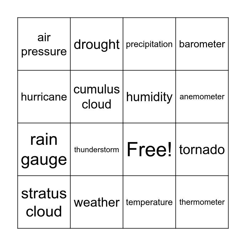 This bingo card has 21 words: weather, climate, drought, flood, temperature, humidity, air pressure, precipitation, Free!, anemometer, rain gauge, barometer, thermometer, cirrus cloud, cumulus cloud, cumulonimbus cloud, stratus cloud, thunderstorm, hurricane, tornado and meteorologist.