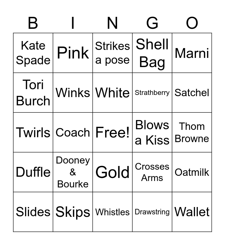 This bingo card has a free space and 67 words: Black, Grey, Maroon, Oatmilk, Cream, Red, Pink, Blue, White, Silver, Gold, Zimmerman, Thom Browne, Marni, Chloe, Tori Burch, Coach, Kate Spade, Michael Kors, Strathberry, Dooney & Bourke, Duffle, Shell Bag, Drawstring, Love Moschino, Leather, Crossbody, Tote, Satchel, Clutch, Wallet, Tickets, Rides Bike, Waves, Kisses the Air, Slides, Spins, Crosses Arms, Twirls, Flips Hair, Head tilt, Winks, Blows a Kiss, High Fives, Jumps, Over the Shoulder Look, Backpack, Skips, Hand on hip, Points to the Audience, Strikes a pose, Snaps Fingers, Lifts Purse High, Dance, Thumbs up, Whistles, Hot Pink, Vanilla, Red, Denim, Rose, Golden Rod, Ruby Red, Wooven Straw, Maroon, Green/Ivory Combo and Gray.