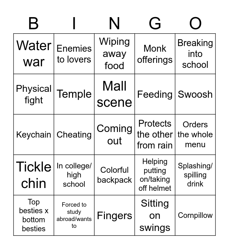This bingo card has 48 words: Homophobic family member, Coming out, Time skip, Fingers, In college/ high school, Oishi, Enemies to lovers, Sulking and drinking, Physical fight, Rich boy, Temple, Monk offerings, Splashing/ spilling drink, Helping putting on/taking off helmet, Puts cold drink on cheek/neck, Panflag, Mall scene, Protects the other from rain, Does something on a completely black screen, Breaking into school, Cheating, Sitting on swings, Water war, Feeding, Gifts a bracelet, Swoosh, Top besties x bottom besties, Taking off glasses glow-up, Colorful backpack, Tickle chin, Sharing headphones, Smells themselves, Framed picture of themselve, Punished for getting late, Forced to study abroad/wants to, Doc, Heartbeat sounds, Orders the whole menu, Music club, Rooftop, Ear nibble, Cornpillow, Wiping away food, Arcade, Keychain, Camping, Breaks up before even getting together and Karaoke.