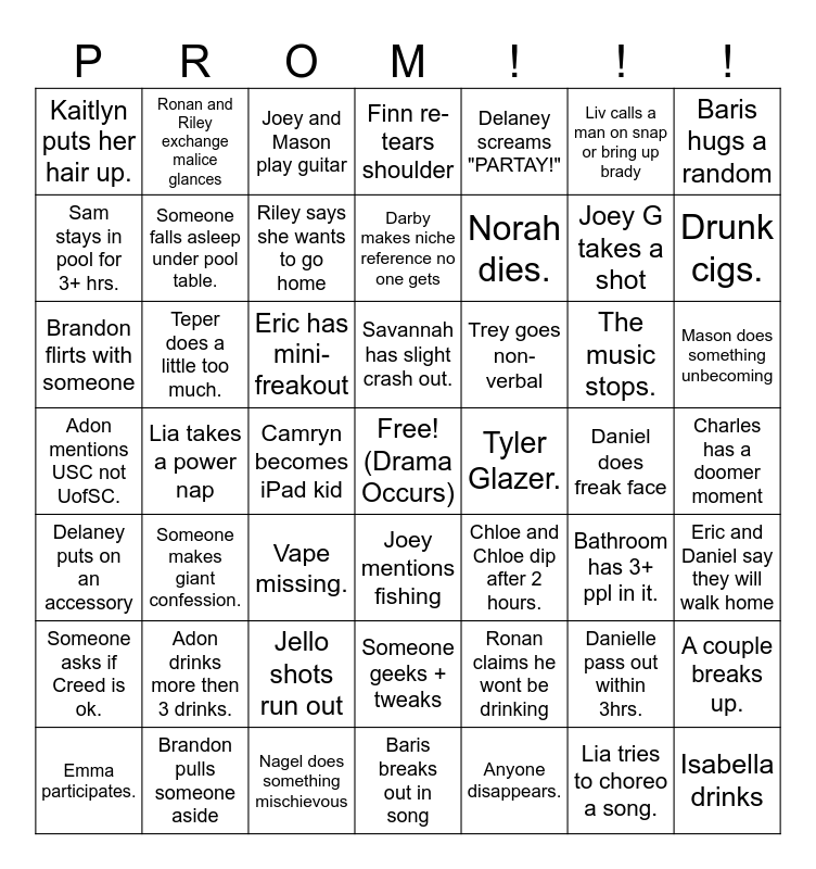 This bingo card has a free space and 48 words: Ronan claims he wont be drinking, Joey G takes a shot, Baris breaks out in song, Lia takes a power nap, Eric has mini-freakout, Charles has a doomer moment, Ronan and Riley exchange malice glances, Brandon pulls someone aside, Liv calls a man on snap or bring up brady, Joey mentions fishing, Baris hugs a random, Finn re-tears shoulder, The music stops., Trey goes non-verbal, Someone asks if Creed is ok., Daniel does freak face, Sam stays in pool for 3+ hrs., Drunk cigs., Danielle pass out within 3hrs., Delaney screams "PARTAY!", Norah dies., Camryn becomes iPad kid, Kaitlyn puts her hair up., Someone falls asleep under pool table., A couple breaks up., Riley says she wants to go home, Mason does something unbecoming, Emma participates., Savannah has slight crash out., Teper does a little too much., Lia tries to choreo a song., Tyler Glazer., Eric and Daniel say they will walk home, Adon drinks more then 3 drinks., Adon mentions USC not UofSC., Chloe and Chloe dip after 2 hours., Bathroom has 3+ ppl in it., Brandon flirts with someone, Vape missing., Jello shots run out, Delaney puts on an accessory, Isabella drinks, Joey and Mason play guitar, Nagel does something mischievous, Darby makes niche reference no one gets, Someone geeks + tweaks, Someone makes giant confession. and Anyone disappears..