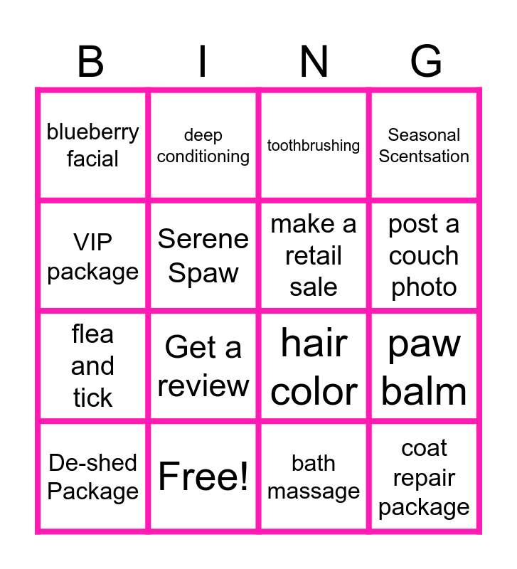 This bingo card has 16 words: Free!, paw balm, toothbrushing, blueberry facial, flea and tick, deep conditioning, hair color, bath massage, VIP package, Serene Spaw, De-shed Package, Seasonal Scentsation, Get a review, post a couch photo, make a retail sale and coat repair package.