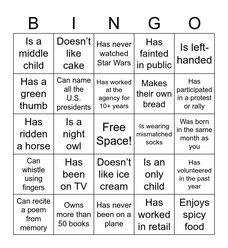 This bingo card has a free space and 100 words: Watches true crime documentaries, Was in a band, Was born in the same month as you, Was born in another country, Wakes up before 6 a.m., Uses a paper planner instead of digital, Still watches Saturday morning cartoons, Still owns a DVD or VHS collection, Still has a childhood toy, Speaks more than two languages, Prefers tea over coffee, Plays video games regularly, Plays a musical instrument, Owns more than 50 books, Owns a vintage car, Owns a hammock, Makes their own bread, Loves pineapple on pizza, Loves Halloween, Likes rainy days more than sunny ones, Knows their astrological sign, Knows how to sew or knit, Knows how to juggle, Knows how to code, Knows how to change a tire, Is wearing mismatched socks, Is left-handed, Is an only child, Is allergic to something odd, Is a vegetarian or vegan, Is a night owl, Is a middle child, Hates breakfast foods, Has written a book or is working on one, Has worked in retail, Has worked at the agency for 10+ years, Has volunteered in the past year, Has twins in the family, Has traveled to more than 5 countries, Has seen the Northern Lights, Has seen a solar eclipse, Has run a marathon, Has ridden a horse, Has read more than 10 books this year, Has participated in a protest or rally, Has never watched Star Wars, Has never had a cavity, Has never broken a bone, Has never been to a wedding, Has never been on a plane, Has milked a cow, Has met someone famous, Has made their own costume, Has made a TikTok video, Has had a surprise party thrown for them, Has gotten lost in a foreign country, Has gotten a speeding ticket, Has gone skydiving, Has gone scuba diving, Has fainted in public, Has eaten something unusual, Has done karaoke, Has completed a triathlon, Has climbed a mountain, Has camped in the last year, Has binged an entire show in 1 weekend, Has been to more than three continents, Has been to a silent disco, Has been to a Renaissance fair, Has been to a concert in the last year, Has been stuck in an elevator, Has been on TV, Has been in a play or musical, Has appeared in a newspaper, Has a tattoo, Has a pet that’s not a cat or dog, Has a nickname only family uses, Has a green thumb, Has a fear of clowns, Has a favorite superhero, Has a collection -stamps, figurines, etc, Enjoys spicy food, Doesn’t like pizza, Doesn’t like ice cream, Doesn’t like chocolate, Doesn’t like cake, Doesn’t have social media, Doesn’t have a smartphone, Doesn’t drink coffee, Can whistle using fingers, Can touch their nose with their tongue, Can speak in a different accent, Can solve a Rubik’s cube, Can recite a poem from memory, Can name all the U.S. presidents, Can name all 50 states, Can drive a stick shift, Can do a celebrity impression, Can do a cartwheel and Believes in Bigfoot.