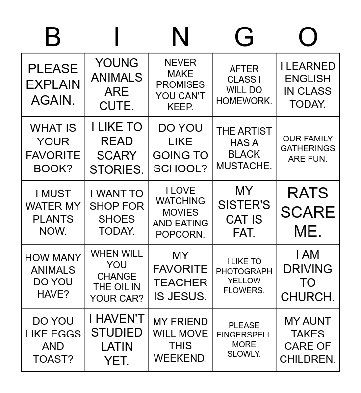 This bingo card has 35 words: THIS BOOK IS LONG AND BORING., TIME TO WAKE UP, BOBBY!, THE BABY DIDN'T SLEEP ALL NIGHT., I LIKE TO READ SCARY STORIES., MY FAVORITE TEACHER IS JESUS., AFTER CLASS I WILL DO HOMEWORK., WHAT IS YOUR FAVORITE BOOK?, I'M LEARNING TO COOK SPAGHETTI., DO YOU LIKE GOING TO SCHOOL?, I LIVE IN DALLAS, TEXAS., I MUST WATER MY PLANTS NOW., I LEARNED ENGLISH IN CLASS TODAY., FREE, I WILL PICK UP MY MEDICINE FROM THE STORE., PLEASE EXPLAIN AGAIN., MY SISTER'S CAT IS FAT., PLEASE FINGERSPELL MORE SLOWLY., I WANT TO SHOP FOR SHOES TODAY., HOW MANY ANIMALS DO YOU HAVE?, I LOVE WATCHING MOVIES AND EATING POPCORN., I LIKE TO PHOTOGRAPH YELLOW FLOWERS., DO YOU LIKE EGGS AND TOAST?, I AM DRIVING TO CHURCH., I HAVEN'T STUDIED LATIN YET., NEVER MAKE PROMISES YOU CAN'T KEEP., OUR FAMILY GATHERINGS ARE FUN., MY AUNT TAKES CARE OF CHILDREN., MY BROTHER WANTS TO PLAY HIS FRIEND., THE ARTIST HAS A BLACK MUSTACHE., RATS SCARE ME., MY DOG DOES NOT LIKE GOING TO VET., MY FRIEND WILL MOVE THIS WEEKEND., WHEN WILL YOU CHANGE THE OIL IN YOUR CAR?, YOUNG ANIMALS ARE CUTE. and OLD TREES ARE TALL..