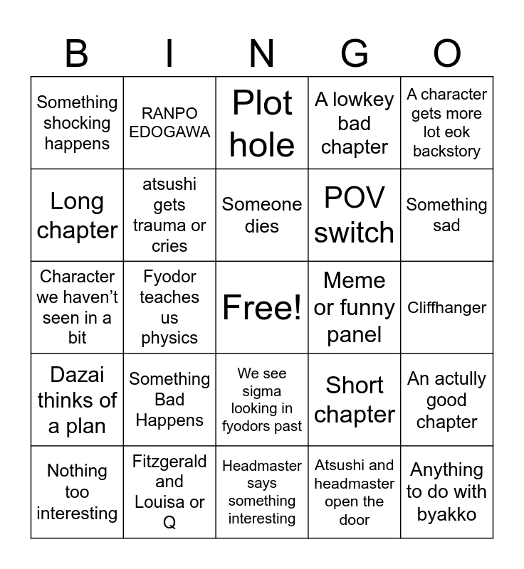 This bingo card has a free space and 24 words: Something Bad Happens, Fitzgerald and Louisa or Q, Someone dies, Nothing too interesting, A character gets more lot eok backstory, Something shocking happens, Long chapter, RANPO EDOGAWA, Meme or funny panel, We see sigma looking in fyodors past, POV switch, Character we haven’t seen in a bit, Short chapter, An actully good chapter, atsushi gets trauma or cries, Atsushi and headmaster open the door, Cliffhanger, Plot hole, Something sad, Fyodor teaches us physics, Anything to do with byakko, Dazai thinks of a plan, A lowkey bad chapter and Headmaster says something interesting.