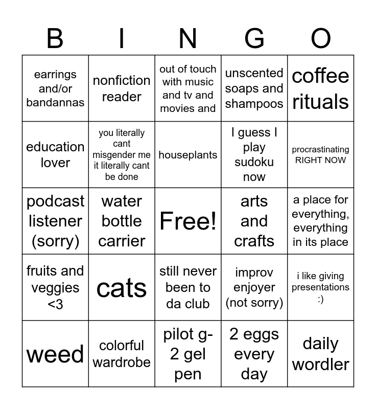 This bingo card has a free space and 24 words: cats, colorful wardrobe, houseplants, weed, coffee rituals, earrings and/or bandannas, education lover, nonfiction reader, arts and crafts, still never been to da club, I guess I play sudoku now, podcast listener (sorry), improv enjoyer (not sorry), i like giving presentations :), you literally cant misgender me it literally cant be done, 2 eggs every day, a place for everything, everything in its place, out of touch with music and tv and movies and, procrastinating RIGHT NOW, water bottle carrier, daily wordler, fruits and veggies <3, unscented soaps and shampoos and pilot g-2 gel pen.