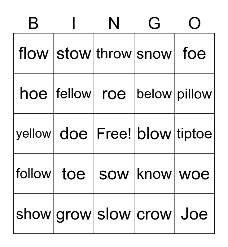 This bingo card has a free space and 24 words: toe, grow, roe, show, foe, flow, hoe, stow, blow, sow, below, yellow, know, woe, fellow, crow, tiptoe, throw, pillow, doe, Joe, follow, snow and slow.