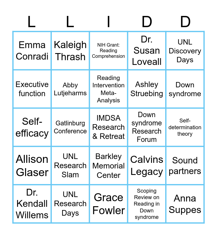 This bingo card has 55 words: Emma Smith, Dr. Kendall Willems, Dr.Emma Kate Thome, Emma Conradi, Grace Fowler, Grace Faltin, Abby Lutjeharms, Melinda Henson, Ashley Struebing, Dr. Pam Bazis, Dr. Susan Loveall, Dr. Weissling, LLIDD!, DSAF Step-Up for Down syndrome Walk, DSAA Buddy Walk, DSAF WDSD, UNL Discovery Days, Gatlinburg Conference, ASHA Convention, IMDSA Research & Retreat, Down syndrome Research Forum, Adaptive Behavior in Down Syndrome, Calvins Legacy, NIH Grant: Reading Comprehension, Babble Bootcamp, Reading Intervention Meta-Analysis, Scoping Review on Reading in Down syndrome, Culturally responsive math instruction, Self-determination theory, Sound partners, Mosaic down syndrome, Floor effects, Establishing basal, Pragmatics, Executive function, Self-efficacy, Parent stress, Allison Glaser, Anna Suppes, Devin Shaughnessy, Kaleigh Thrash, Sydney Hobza, Learning Lab for Intellectual and Developmental Disabilities, Barkley Research Slam, UNL Research Slam, UNL Research Days, NSLHA Conference, The Home Literacy Environment, Speech-Language History and Educational Environment, Down syndrome, Intellectual Disability, Autism, Ashley Franzen, Barkley Memorial Center and Special Education and Communication Disorders.