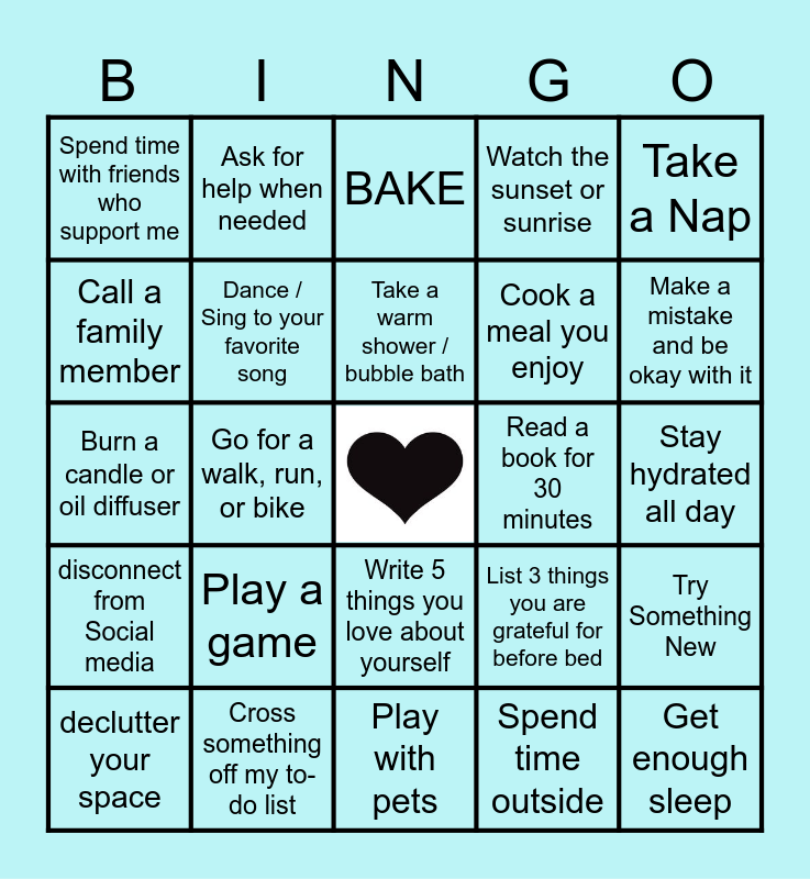 This bingo card has a free space and 24 words: Play a game, Cross something off my to-do list, Take a warm shower / bubble bath, declutter your space, Take a Nap, Spend time with friends who support me, Call a family member, Ask for help when needed, Read a book for 30 minutes, Write 5 things you love about yourself, Cook a meal you enjoy, Burn a candle or oil diffuser, List 3 things you are grateful for before bed, Try Something New, Dance / Sing to your favorite song, Spend time outside, Stay hydrated all day, BAKE, Make a mistake and be okay with it, Go for a walk, run, or bike, Get enough sleep, disconnect from Social media, Watch the sunset or sunrise and Play with pets.