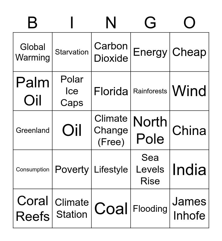 This bingo card has a free space and 31 words: Coal, Natural Gas, Oil, Fossil Fuels, Global Warming, Carbon Dioxide, Polar Ice Caps, Sea Levels Rise, North Pole, Flooding, China, James Inhofe, Renewable Energy, Solar, Wind, Disinformation, India, Poverty, Consumption, Lifestyle, Cheap, Islands, Coral Reefs, Starvation, Rainforests, Palm Oil, Energy, Greenland, Climate Station, Florida and Politician.