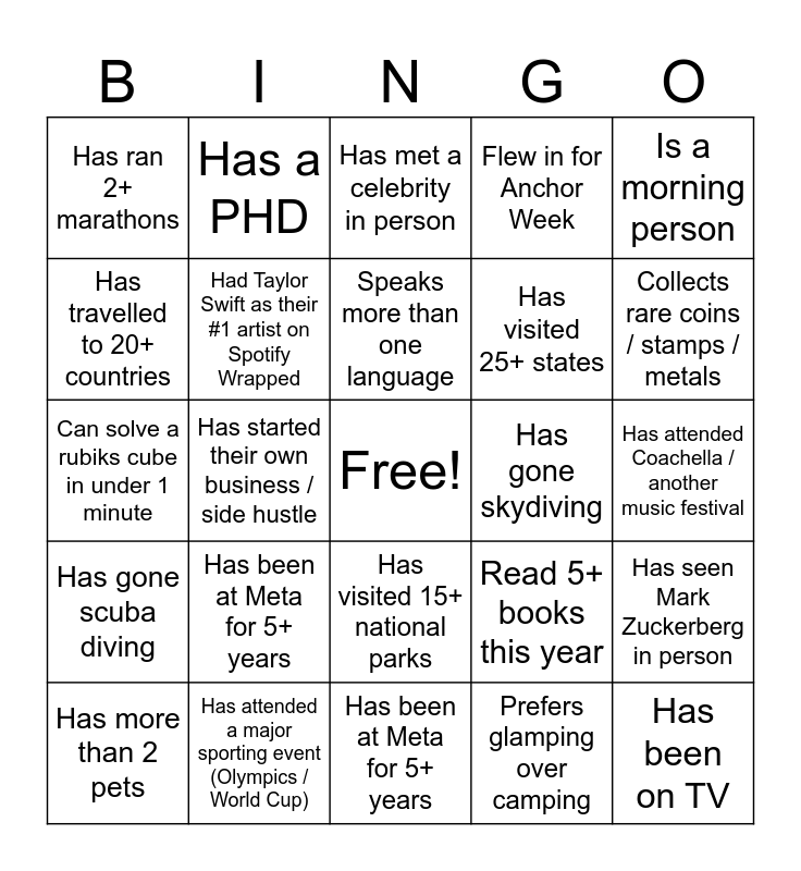 This bingo card has a free space and 25 words: Has been at Meta for 5+ years, Has been at Meta for 5+ years, Speaks more than one language, Has more than 2 pets, Is a morning person, Has ran 2+ marathons, Has travelled to 20+ countries, Has a PHD, Has gone skydiving, Has visited 15+ national parks, Has visited 25+ states, Can solve a rubiks cube in under 1 minute, Read 5+ books this year, Has seen Mark Zuckerberg in person, Had Taylor Swift as their #1 artist on Spotify Wrapped, Has a sibling, Has attended Coachella / another music festival, Has met a celebrity in person, Collects rare coins / stamps / metals, Has started their own business / side hustle, Has been on TV, Has attended a major sporting event (Olympics / World Cup), Has gone scuba diving, Flew in for Anchor Week and Prefers glamping over camping.