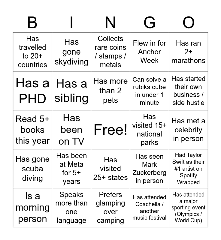 This bingo card has a free space and 24 words: Has been at Meta for 5+ years, Speaks more than one language, Has more than 2 pets, Is a morning person, Has ran 2+ marathons, Has travelled to 20+ countries, Has a PHD, Has gone skydiving, Has visited 15+ national parks, Has visited 25+ states, Can solve a rubiks cube in under 1 minute, Read 5+ books this year, Has seen Mark Zuckerberg in person, Had Taylor Swift as their #1 artist on Spotify Wrapped, Has a sibling, Has attended Coachella / another music festival, Has met a celebrity in person, Collects rare coins / stamps / metals, Has started their own business / side hustle, Has been on TV, Has attended a major sporting event (Olympics / World Cup), Has gone scuba diving, Flew in for Anchor Week and Prefers glamping over camping.