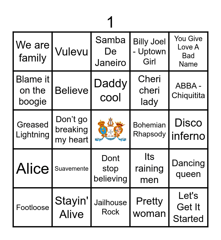 This bingo card has a free space and 45 words: I Gotta Feeling, Let's Get It Started, Bongo Cha Cha Cha, Footloose, Mamma Mia, Pretty woman, Samba De Janeiro, Simply the Best, You Give Love A Bad Name, Stayin' Alive, Billy Joel - Uptown Girl, Bohemian Rhapsody, Dont stop believing, Suavemente, Blue Suede Shoes, Jailhouse Rock, I Love Rock 'n' Roll, Greased Lightning, Gimme gimme gimme, ABBA - Chiquitita, Vulevu, I will survive, Y.M.C.A, We are family, September, Disco inferno, Funky town, So excited, Its raining men, Alice, Ghost busters, Dancing queen, Live grows, Lemon three, Looking for a hero, Don’t go breaking my heart, Time of my life, River of Babylon, Rasputin, Daddy cool, Blame it on the boogie, Cheri cheri lady, Turn back time, Believe and Born to be alive.