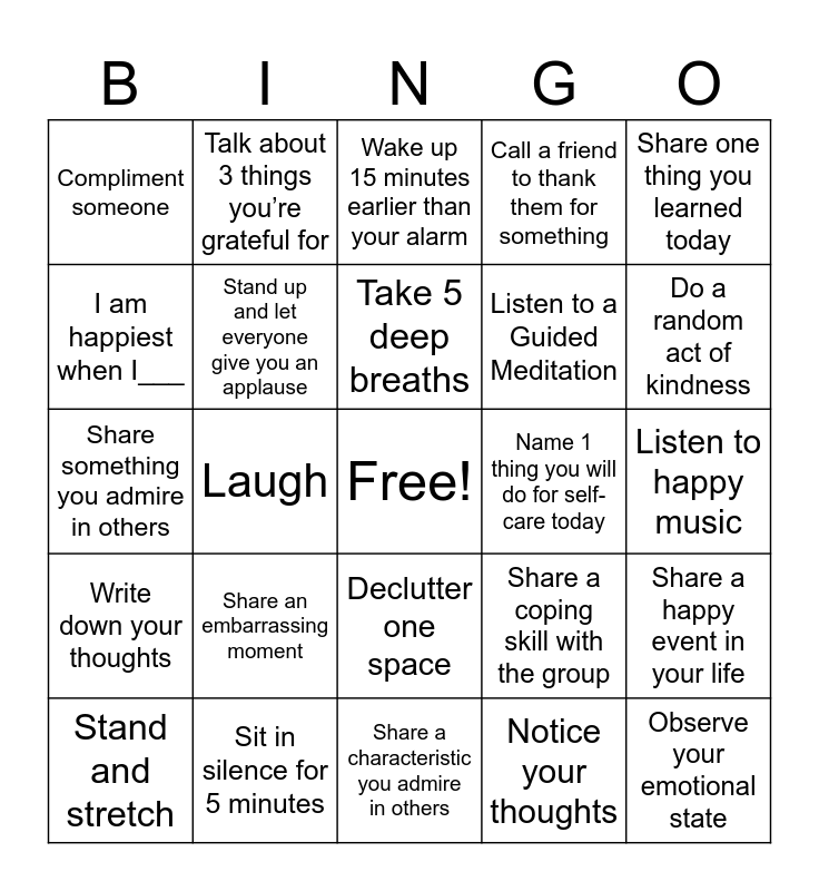 This bingo card has a free space and 52 words: Set a small goal, Observe your emotional state, Tell a joke, Share a characteristic you admire in others, Share an embarrassing moment, Give someone a high five, Talk about 3 things you’re grateful for, Do a self-check in [where am I on a 1-10 right now], I am happiest when I___, I feel good about myself when___, Stand up and let everyone give you an applause, State a positive affirmation, Share a happy event in your life, Share a coping skill with the group, Visualize you are in your happy place. Where is it? What is it like?, Look around and list 3 things you see, Take 5 deep breaths, Name 1 thing you will do for self-care today, Describe something someone could do to make you happy, Share one thing you learned today, Laugh, Notice your thoughts, Compliment someone, Listen to a Guided Meditation, Enjoy a meditative walk, Do something creative, Have a vulnerable conversation, Write someone a thank you note, Do a random act of kindness, Practice yoga, Write down 3 things you think about daily and how to overcome or accept them, Call a friend to thank them for something, Brainstorm on ways you can leave a positive impact, Do volunteer work, Write down your fears and discuss them with a friend, Wake up 15 minutes earlier than your alarm, Sit in silence for 5 minutes, Exercise at least 30 minutes, Smile, Tell someone how much you care, Take a break from technology for 1 hour, Listen to happy music, Write down your thoughts, Tell 2 people thank you, Declutter one space, Write a to-do list, I am proud of Myself for_, Share something you admire in others, Name something new you would like to try, Give yourself a pat on the back, Stand and stretch and Doodle.