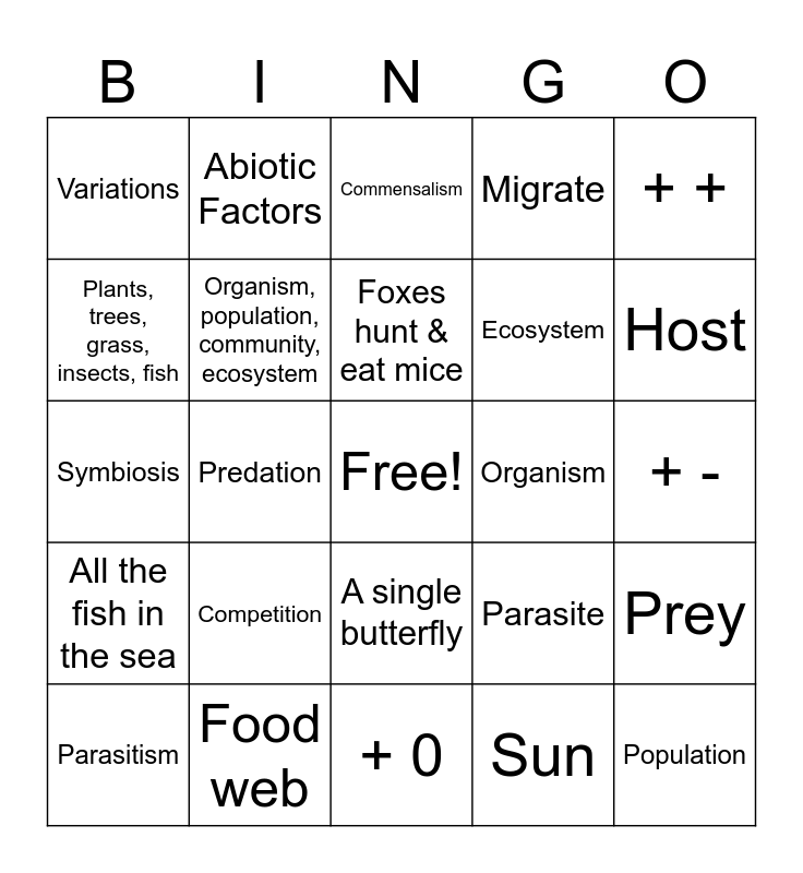 This bingo card has a free space and 24 words: Competition, Food web, Foxes hunt & eat mice, Parasitism, + +, Variations, Plants, trees, grass, insects, fish, Abiotic Factors, Organism, A single butterfly, Ecosystem, Symbiosis, Parasite, Prey, Organism, population, community, ecosystem, Sun, + -, Commensalism, Host, Predation, Population, All the fish in the sea, Migrate and + 0.