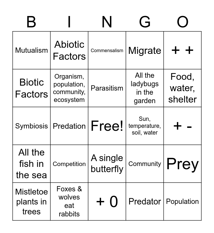 This bingo card has a free space and 24 words: Competition, Foxes & wolves eat rabbits, Parasitism, Mistletoe plants in trees, + +, Mutualism, Biotic Factors, Abiotic Factors, Sun, temperature, soil, water, A single butterfly, All the ladybugs in the garden, Symbiosis, Community, Prey, Organism, population, community, ecosystem, Predator, + -, Commensalism, Food, water, shelter, Predation, Population, All the fish in the sea, Migrate and + 0.