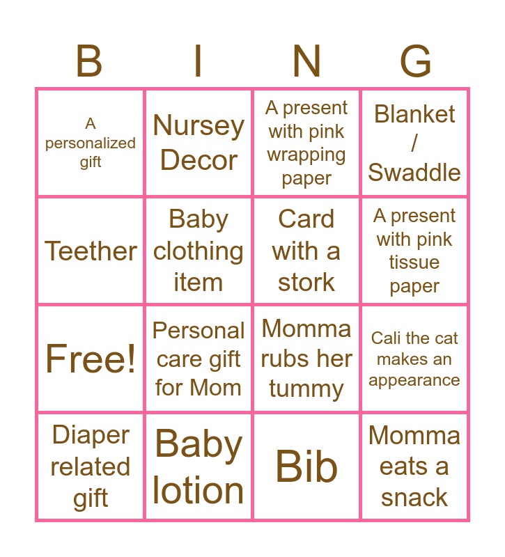 This bingo card has 20 words: Cali the cat makes an appearance, Baby Toy, A present with pink wrapping paper, Momma takes a sip from her drink, Diaper related gift, Teether, Baby lotion, A personalized gift, Free!, Nursey Decor, Personal care gift for Mom, Momma rubs her tummy, Baby clothing item, Momma eats a snack, Card with a stork, A present that has sparkles, A present with pink tissue paper, Blanket / Swaddle, Bib and Card with balloons.