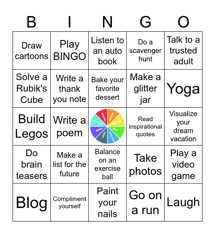 This bingo card has a free space and 29 words: Blog, Read a joke book, Write a poem, Drink cold water, Draw cartoons, Listen to an auto book, Write a thank you note, Make a list for the future, Read inspirational quotes, Compliment yourself, Visualize your dream vacation, Laugh, Paint your nails, Go on a run, Yoga, Stack Objects, Balance on an exercise ball, Do brain teasers, Talk to a trusted adult, Build Legos, Take photos, Write a story, Make a glitter jar, Solve a Rubik's Cube, Do a scavenger hunt, Play BINGO, Play a video game, Bake your favorite dessert and Sing your favorite song.