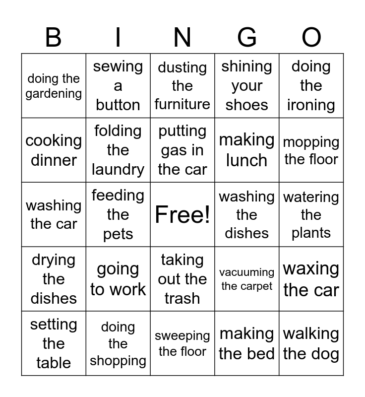 This bingo card has a free space and 29 words: setting the table, doing the laundry, feeding the pets, doing homework, doing the gardening, dusting the furniture, folding the laundry, going to work, washing the dishes, doing the shopping, watering the plants, walking the dog, sweeping the floor, making the bed, mopping the floor, mowing the lawn, taking out the trash, drying the dishes, doing the ironing, washing the car, vacuuming the carpet, cleaning the windows, making lunch, cooking dinner, shining your shoes, sewing a button, waxing the car, putting gas in the car and loading the dishwasher.