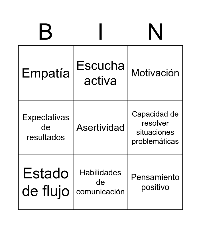 This bingo card has 15 words: Conciencia emocional, Control emocional, Motivación, Empatía, Habilidades de comunicación, Asertividad, Indefensión aprendida, Ansiedad, Capacidad de resolver situaciones problemáticas, Pensamiento positivo, Expectativas de eficacia, Expectativas de resultados, Estado de flujo, Escucha activa and Equilibrio entre razón y emoción.
