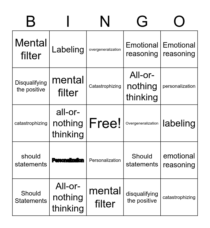 This bingo card has a free space and 24 words: Personalization, All-or-nothing thinking, Catastrophizing, Should Statements, Emotional reasoning, Mental filter, Disqualifying the positive, Labeling, Overgeneralization, Personalization, All-or-nothing thinking, catastrophizing, Should statements, emotional reasoning, mental filter, disqualifying the positive, labeling, overgeneralization, personalization, all-or-nothing thinking, catastrophizing, should statements, Emotional reasoning and mental filter.
