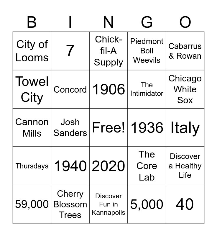 This bingo card has a free space and 25 words: 1940, Discover Fun in Kannapolis, 1906, 59,000, Cabarrus & Rowan, City of Looms, Towel City, 7, 1936, 2020, The Intimidator, Cannon Mills, The Core Lab, Discover a Healthy Life, Concord, Eastside Park, Italy, Chick-fil-A Supply, Chicago White Sox, Josh Sanders, 40, Cherry Blossom Trees, Thursdays, Piedmont Boll Weevils and 5,000.