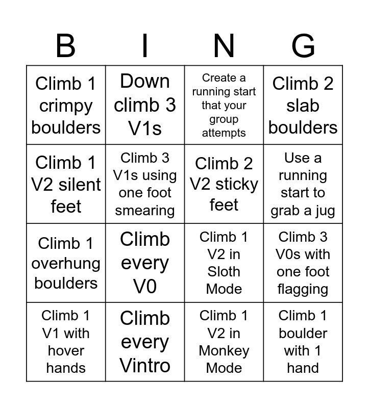 This bingo card has 16 words: Climb every Vintro, Climb 3 V0s with one foot flagging, Create a running start that your group attempts, Climb 1 crimpy boulders, Climb 1 overhung boulders, Down climb 3 V1s, Climb 1 V2 in Sloth Mode, Climb 1 V2 in Monkey Mode, Climb 1 V2 silent feet, Climb 3 V1s using one foot smearing, Climb 1 V1 with hover hands, Climb 2 slab boulders, Climb every V0, Use a running start to grab a jug, Climb 2 V2 sticky feet and Climb 1 boulder with 1 hand.