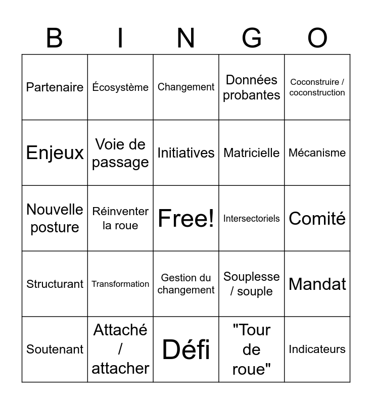 This bingo card has a free space and 58 words: Arrimage / arrimer, Attaché / attacher, Novateur, Structurant, "Tour de roue", Chantier, Voie de passage, Agile / agilité, Matricielle, Synergie, Données probantes, NOS / LES autorités, Reddition de comptes, Intersectoriel, Tranvsersal, Partenaire, Indicateurs, Coconstruire / coconstruction, Paradigme, Initiatives, Intersectoriels, Changement, Soutenant, Mandat, Priorisation, Comité, Collaboration, Structure de gouvernance, Mécanisme, Décloisonnement, Travailler en silo, Concret, Mailler / maillage, Processus, Meilleures pratiques, Avancer en continu, Sentiment d'uniformité, Réinventer la roue, Nouvelle posture, Adaptabilité, Transformation, Flexibilité / flexible, Souplesse / souple, Performance, Tableau de bord, Classement, MSSS 2.0, Gestion du changement, Défi, Priorité / prioritaire, Mission, Principe directeur, Planification annuelle, Ressources, Écosystème, Crédits, Enjeux and Opportunités.