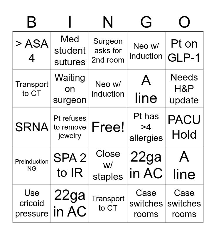This bingo card has a free space and 87 words: Declared Crani, Pt on GLP-1, Close w/ staples, Med student sutures, Prone Case, Contaminated Tray, Waiting on Transport, TIVA, Preinduction NG, Pt has loose teeth, Anes Start 0715, In patient w/ bad IV, A line, PACU Hold, Aortic Stenosis, Neo w/ induction, Waiting on surgeon, 180 degree case, "urgent" c section, NPO status delay, BMI > 60, Evoked Potentials, SRNA, Use cricoid pressure, Case switches rooms, Case switches rooms, Styker has to fix something, Baylis goes past 5 pm, Needle stick, Surgeon asks for 2nd room, 22ga in AC, Code Yellow or Brown, Transfuse Blood Products, SPA 2 to IR, Transport to CT, Cancelled MRI, Needs H&P update, MD s/s, Neostigmine & Robinul, Pt refuses to remove jewelry, 1E needs an IV, IR Go, > ASA 4, Pt has >4 allergies, Declared Crani, Pt on GLP-1, Close w/ staples, Med student sutures, Prone Case, Contaminated Tray, Waiting on Transport, TIVA, Preinduction NG, Pt has loose teeth, Anes Start 0715, In patient w/ bad IV, A line, PACU Hold, Aortic Stenosis, Neo w/ induction, Waiting on surgeon, 180 degree case, "urgent" c section, NPO status delay, BMI > 60, Evoked Potentials, SRNA, Use cricoid pressure, Case switches rooms, Styker has to fix something, Baylis goes past 5 pm, Needle stick, Surgeon asks for 2nd room, 22ga in AC, Code Yellow or Brown, Transfuse Blood Products, SPA 2 to IR, Transport to CT, Cancelled MRI, Needs H&P update, MD s/s, Neostigmine & Robinul, Pt refuses to remove jewelry, 1E needs an IV, IR Go, > ASA 4 and Pt has >4 allergies.